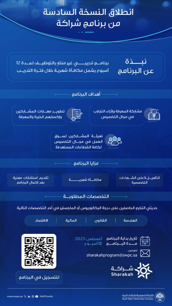 الشركة السعودية لشراكات المياه تطلق برنامج “شراكة” التدريبي بنسخته السادسة